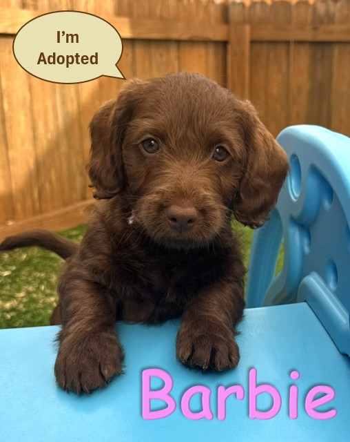 Barbie is a brown beauty with a heart full of sweetness and a playful twinkle in her eye. She’s still discovering her favorite things, but she’s already showing signs of being a loving, curious little girl. Whether she’s cuddling up for a nap or bouncing around with her siblings, Barbie brings lots of playfulness, warmth, and charm to every moment. She’s ready to grow into your perfect companion—full of love, laughter, and puppy kisses.